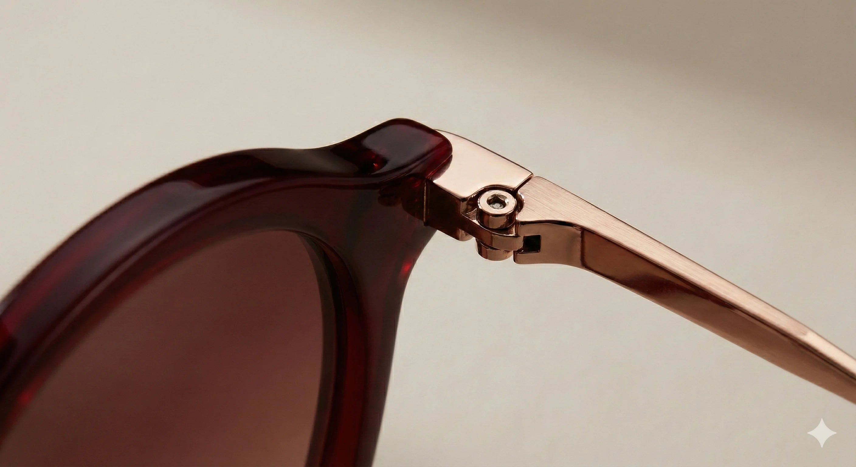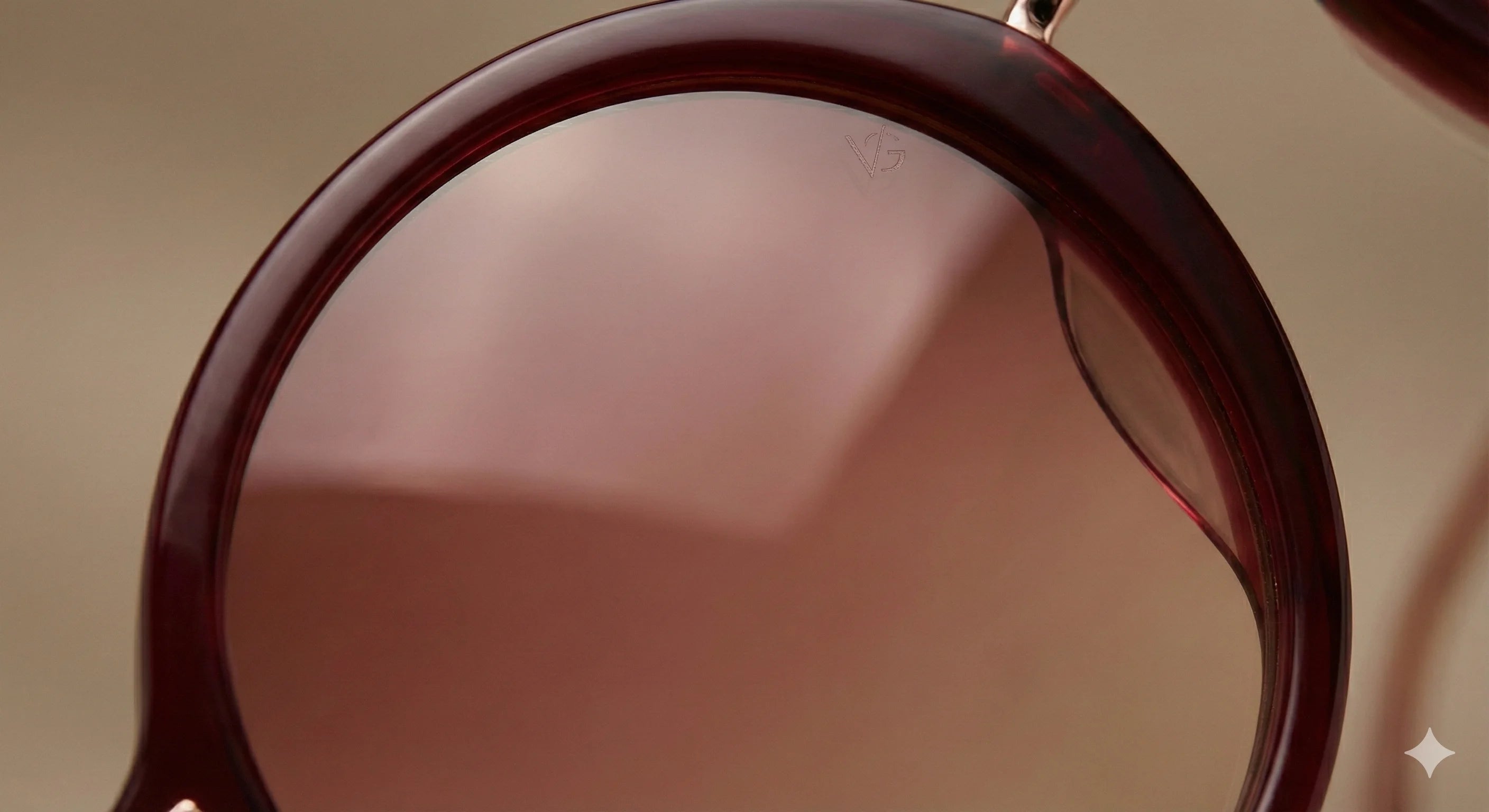 A statement piece of modern glamour, The Luna features a dramatic, oversized round silhouette. The frame front is hand-polished from rich, deep Burgundy Italian acetate, offering a luxurious depth of color. This is beautifully contrasted by slender, engraved temple arms and a delicate nose bridge crafted from polished rose gold titanium. Fitted with premium CR-39 gradient rose-brown lenses, The Luna provides elegant sun protection with a warm, sophisticated outlook.